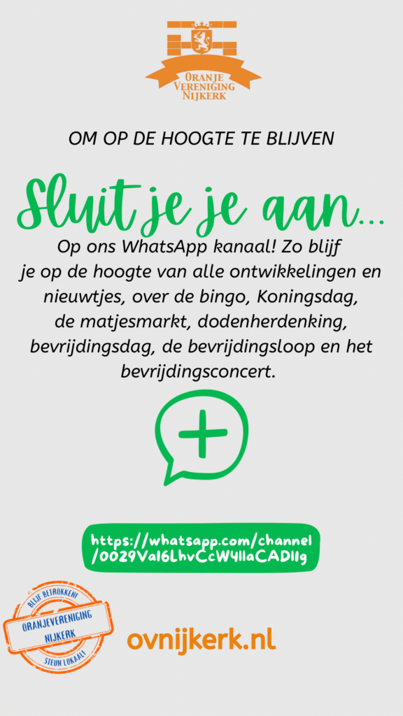 Vanaf 2 januari 2024 hebben wij nu ook een eigen WhatsApp kanaal. Via dit kanaal houden wij iedereen op de hoogte van het laatste nieuws en alle ontwikkelingen over Koningsdag, de bingo, dodenherdenking en bevrijdings(loop)(concert)dag.